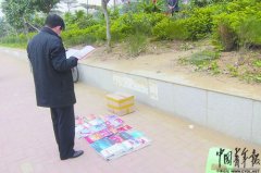 在北海市海景大道楼盘前的广场上,小贩摆摊兜售非法传销出版物。 本报记者谢洋摄 5月1...